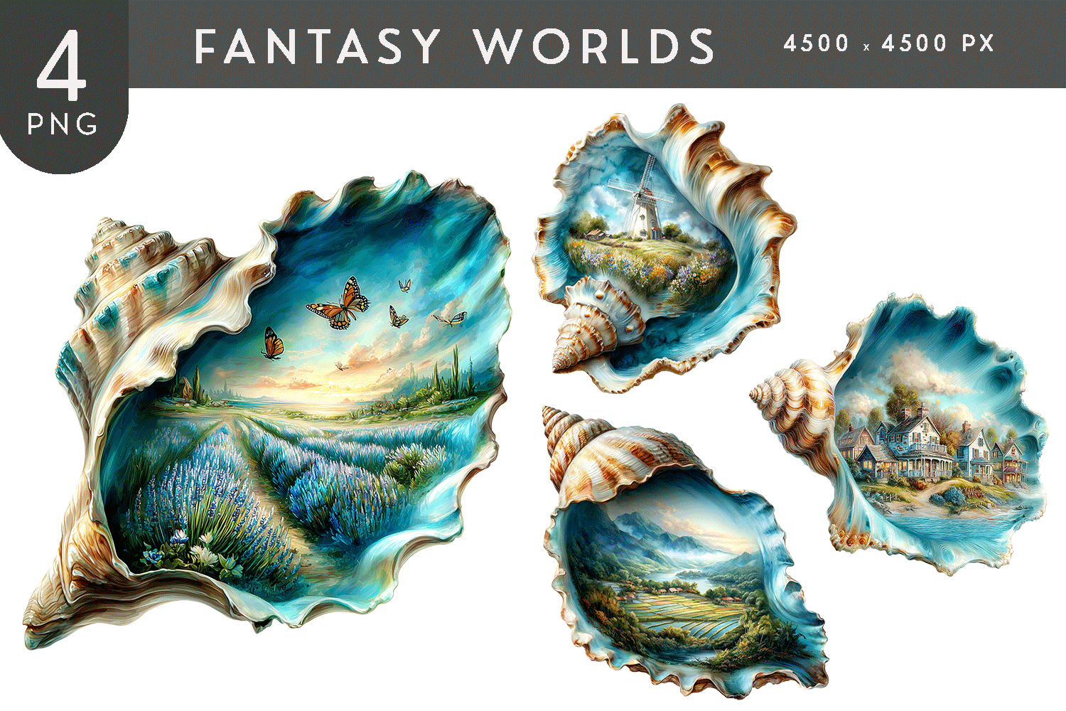 This surreal fantasy seashell worlds clipart bundle features four expressive conch shells revealing imaginative inner worlds that blend ocean elements with forests, fields, and cascading water. The artistic composition and glowing color palette create a captivating fantasy aesthetic suited for digital art projects, journals, wall art, scrapbooking, and visually rich creative designs.