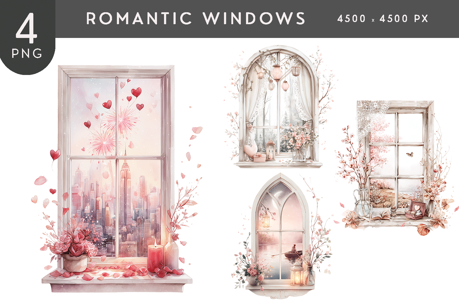 This romantic Valentine window frames PNG bundle features charming window designs framing enchanted love-filled scenes beyond the glass. With floral accents, glowing light, and dreamy outdoor views, these illustrations bring a magical Valentine atmosphere to any creative project.