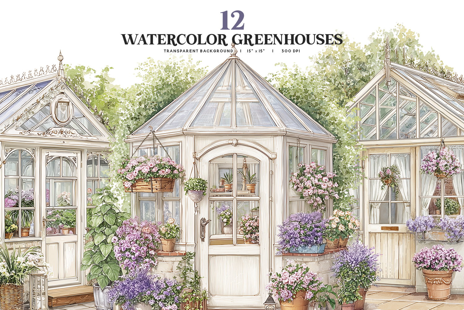 This watercolor greenhouse clipart set features beautifully illustrated garden greenhouses filled with blooming flowers and potted plants, perfect for adding a soft, elegant, and botanical feel to projects such as wall art, invitations, stationery, planners, journals, scrapbooking, branding, and printable designs, with a charming cottage garden aesthetic that works seamlessly for both modern and vintage inspired creations.