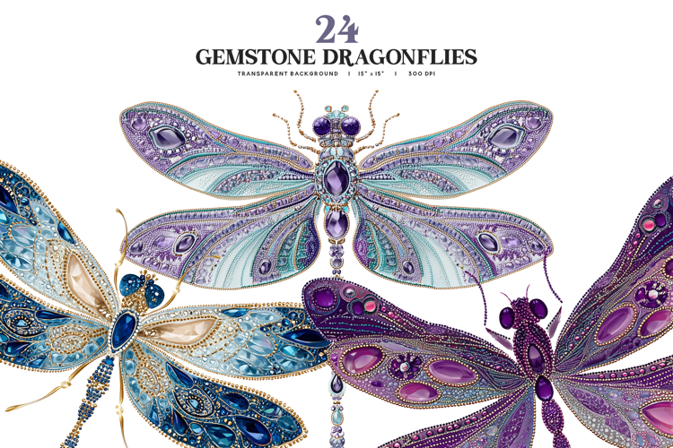 This gemstone dragonfly clipart set showcases dazzling jeweled dragonflies with intricate crystal and bead details, perfect for buyers creating luxury-inspired designs such as wall art, invitations, branding, stickers, journals, sublimation prints, fantasy artwork, and decorative projects that need an elegant, magical, and eye-catching focal element with rich color and sparkling visual impact.