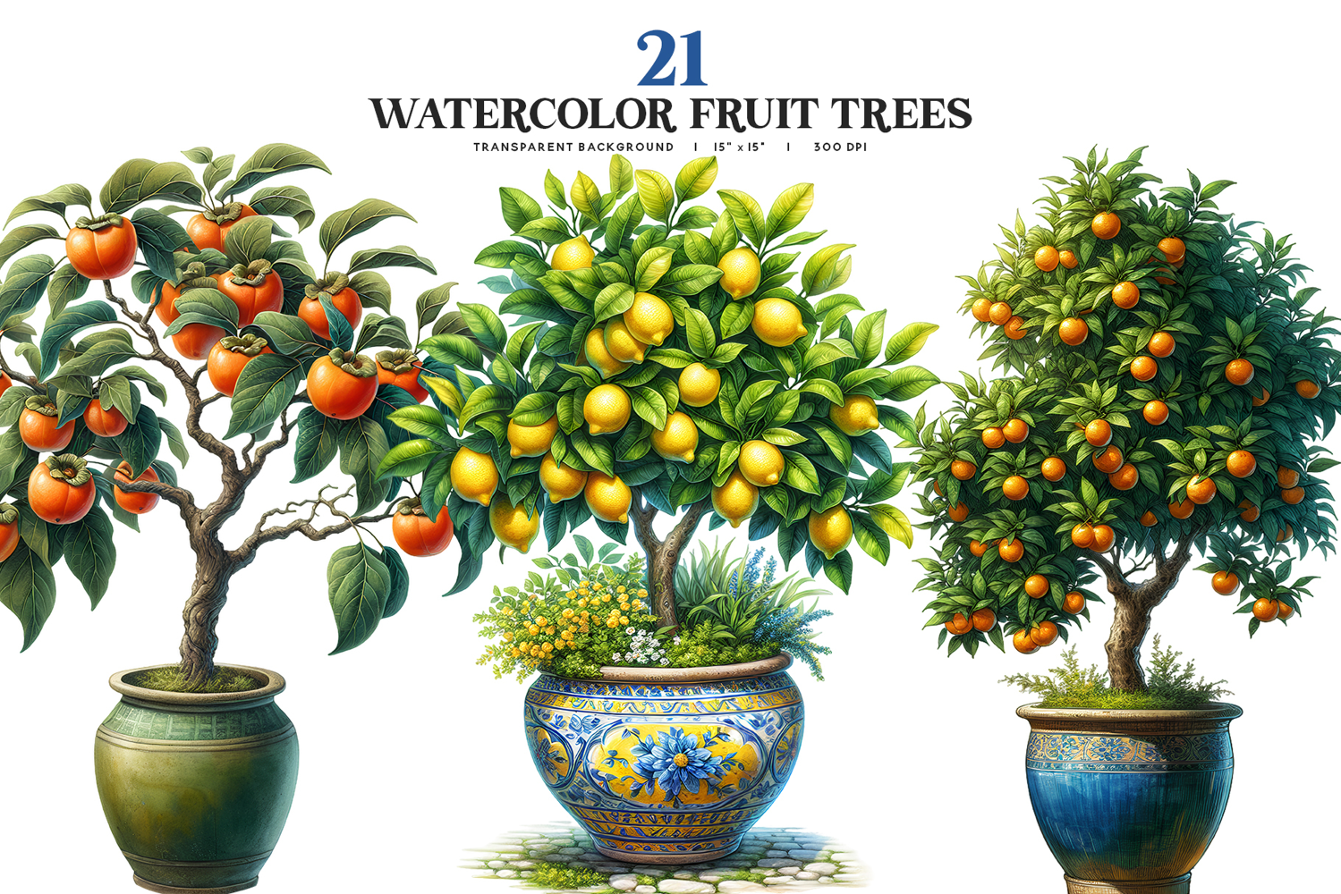This watercolor clipart set features realistic potted fruit trees with lush green foliage and ripe fruit, illustrated in a detailed natural style that buyers look for when creating garden themed wall art, kitchen decor, farmhouse designs, planners, packaging, labels, recipe cards, stationery, and botanical inspired artwork, offering a fresh and elegant look that works beautifully for both decorative and functional creative projects.