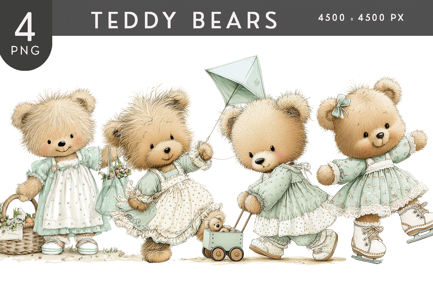 This teddy bear lifestyle clipart set features four adorable bears illustrated in everyday human inspired moments, ideal for buyers creating modern nursery art, planners, journals, wall prints, stickers, and cozy themed designs that highlight gentle lifestyle storytelling through cute character artwork.