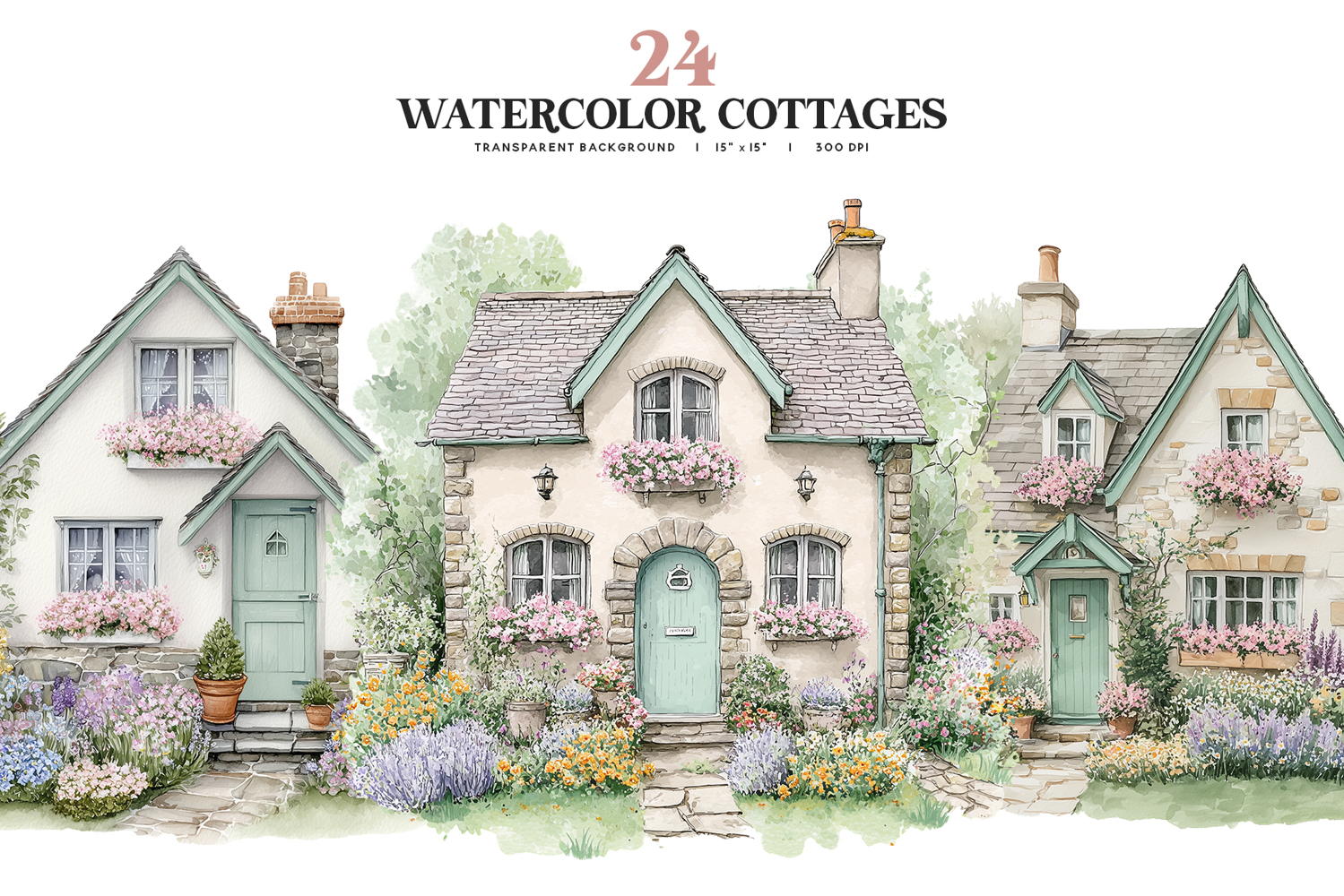 This watercolor cottage clipart set is created for designers and makers drawn to soft cottagecore aesthetics and peaceful countryside scenes. Featuring charming homes surrounded by flowers and greenery, these illustrations are ideal for wall art, stationery, journals, planners, invitations, branding, and decorative craft projects. The gentle color palette and storybook style bring a calm, nostalgic feel to designs inspired by slow living, cozy homes, and romantic garden settings.