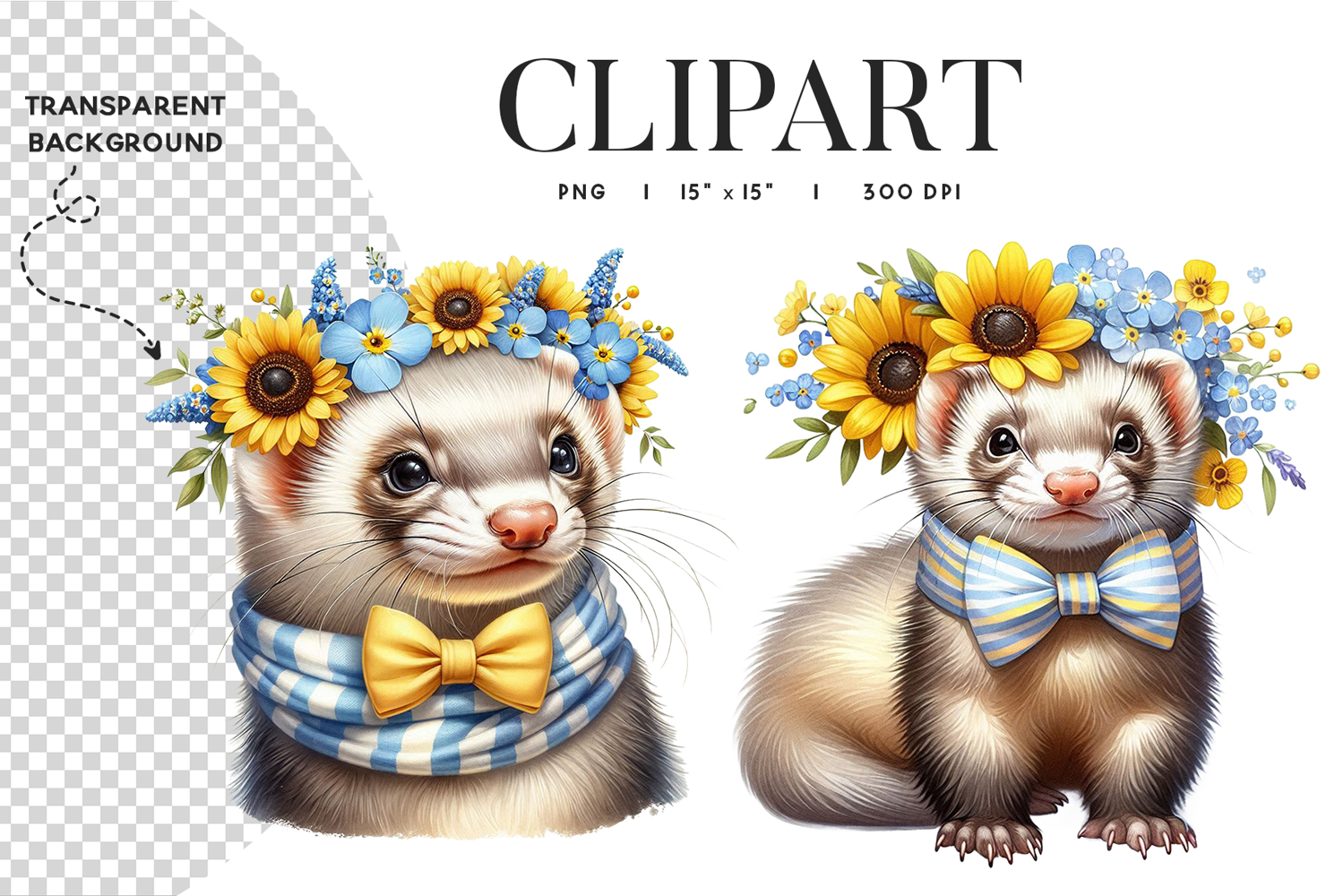 These sweet summer ferret portrait clipart images feature two beautifully detailed close-up ferrets dressed in blue and white striped scarves and golden yellow bow ties, each crowned with a cheerful floral arrangement of bold sunflowers, soft blue forget-me-nots, and delicate wildflowers. Rendered in a realistic yet whimsical style with transparent backgrounds, these high-resolution 300 DPI PNG files are perfect for summer cards, garden-themed prints, sunshine-inspired stationery, bright floral designs, and cheerful digital craft projects.