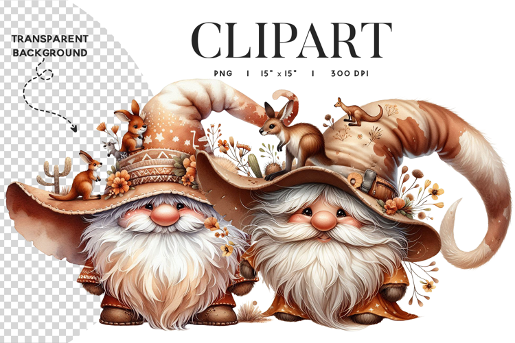 This charming Australian gnome clipart set features two beautifully detailed gnomes wearing enormous wide-brimmed outback hats adorned with kangaroos, joeys, native wildflowers, desert botanicals, and cacti in warm earthy tones of tan, rust, and amber, each with a magnificent flowing white beard and dressed in cozy ochre robes that perfectly capture the whimsy of the Australian bush. Rendered in a soft watercolor style with transparent backgrounds, these high-resolution 300 DPI PNG files are perfect for Australian-themed cards, outback prints, Aussie animal designs, native botanical stationery, and unique digital craft projects.