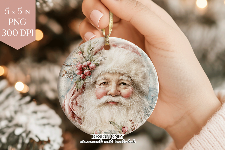 Bring old-world Christmas charm to your ornament collection with this painterly Father Christmas sublimation design, featuring a warmly rendered portrait of Santa with soft blue eyes, a billowing white beard, and a hat trimmed with pale pink roses and winter botanicals. Clusters of vivid red berries and glossy holly leaves complete the timeless festive look. This 5x5 inch, 300 DPI PNG file is perfectly sized for sublimation onto round ceramic or hardboard ornament blanks and is ready to use straight from the download.