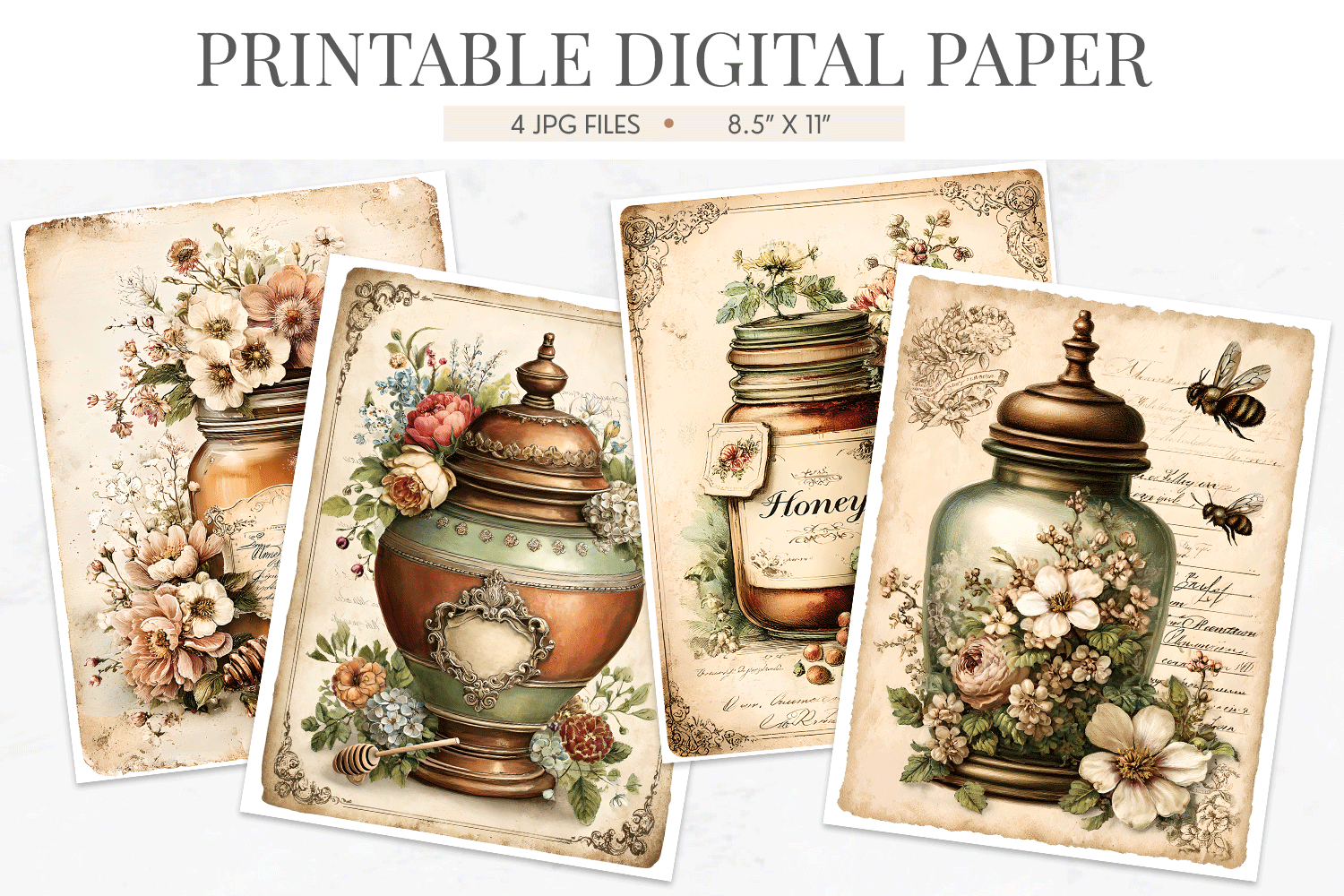 Four printable digital papers featuring ornate antique apothecary jars and honey vessels surrounded by lush watercolor botanicals, berries, and florals on aged parchment backgrounds with vintage script and distressed edges. A romantic Victorian cottagecore aesthetic perfect for junk journals, scrapbooking, collage art, card making, and mixed media projects. Includes 4 JPG files at 8.5x11 inches, ready to print at home or your local print shop.