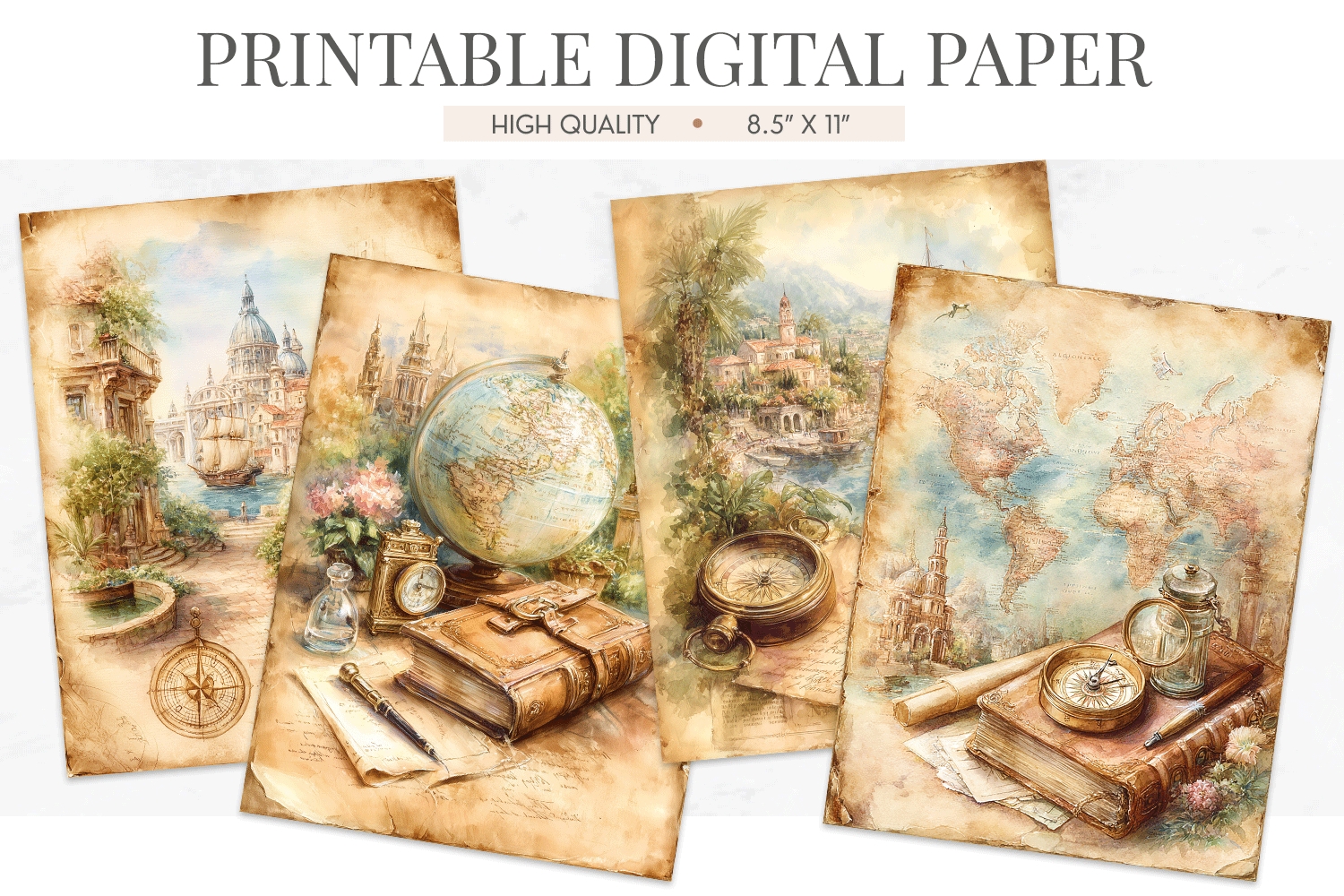 Capture the charm of old-world exploration with this vintage travel digital paper set featuring beautifully aged textures, antique maps, globes, and scenic European landscapes in warm watercolor tones. Perfect for junk journals, scrapbooking, decoupage, stationery, and creative paper crafts, these printable designs add a timeless, nostalgic feel to any project while bringing elegance and storytelling to your handmade creations.