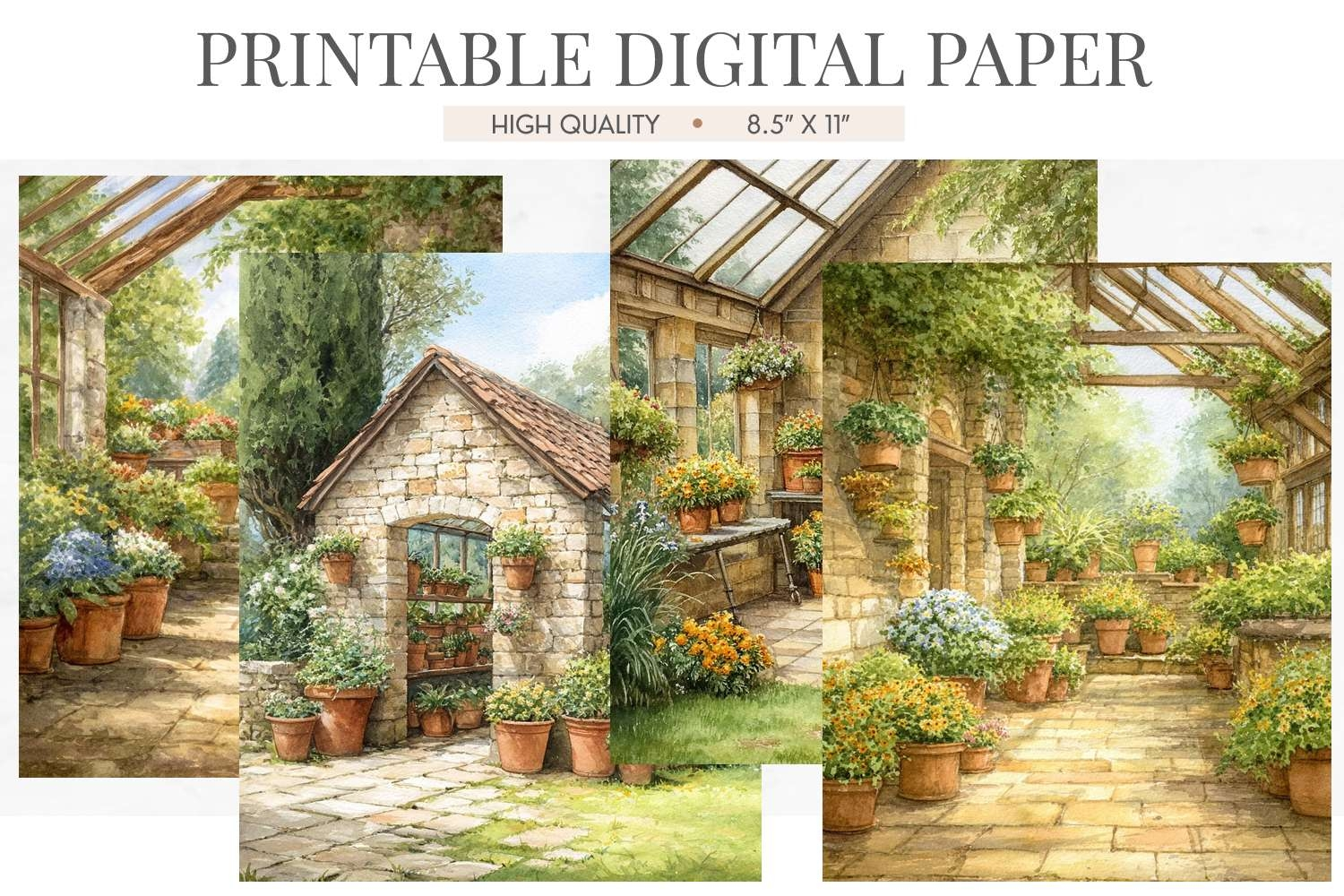 Botanical Scrapbook Paper Greenhouse Digital Paper Potted Flower Printable Garden Conservatory Paper Flower Pot Journal Page Terracotta Planter Design Garden Path Printable Greenhouse Flower Paper Cottage Garden Digital Blooming Garden Paper