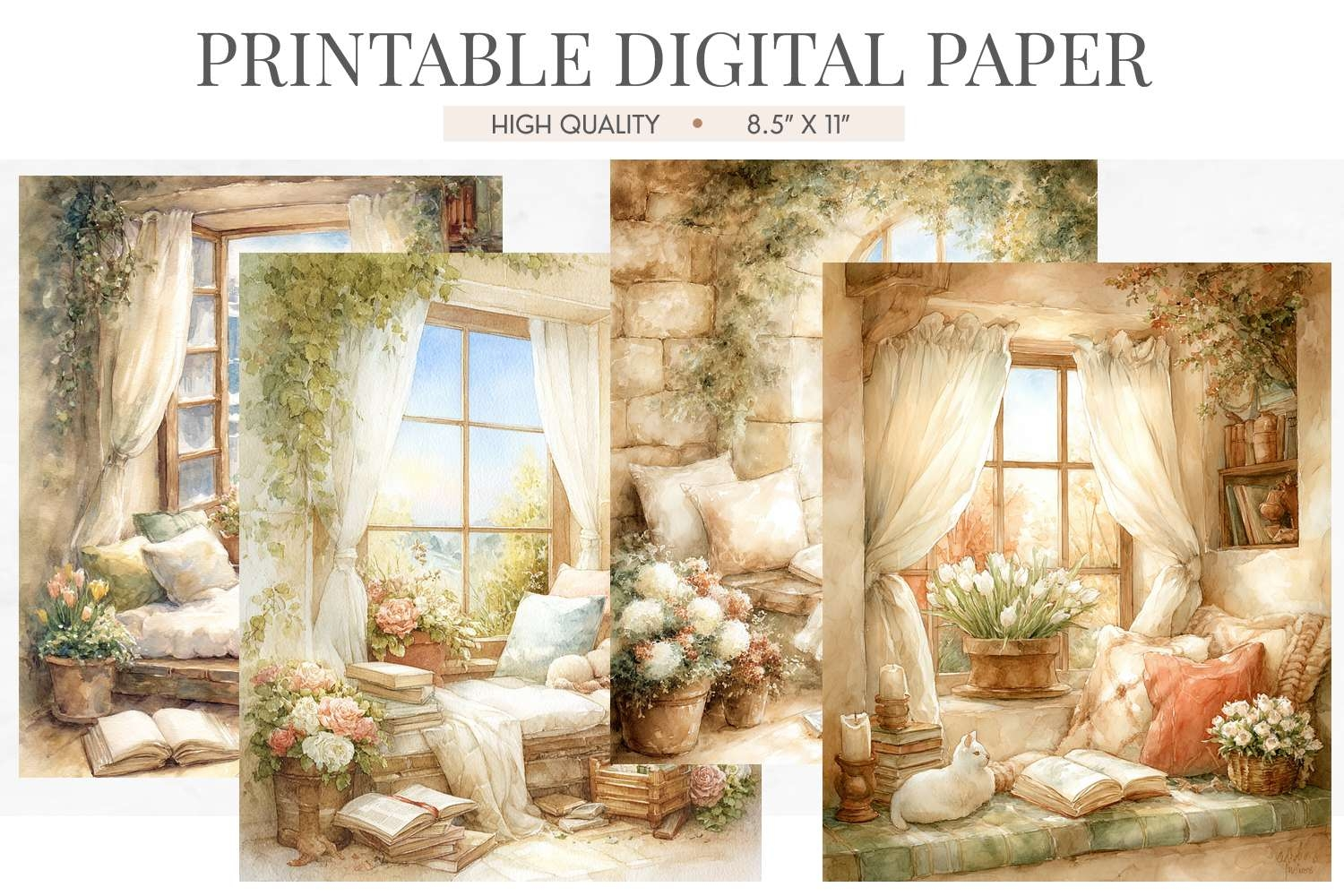 Rooftop Window City View Digital Paper - a charming collection of cozy window nook illustrations with urban backdrops, perfect for junk journals, scrapbooking, card making, and all your paper crafting projects. These lovely designs feature cushioned window seats overlooking city rooftops, with tulips, open books, and soft draping curtains.