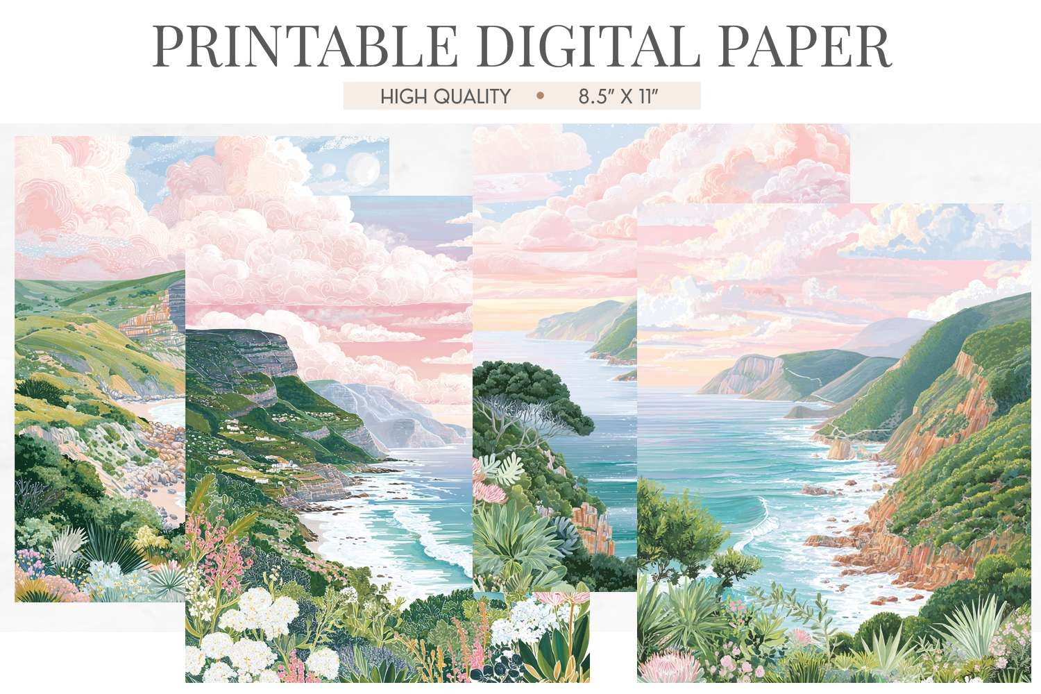 Four breathtaking junk journal pages featuring illustrated scenes of the Garden Route in South Africa with dramatic coastal cliffs, turquoise waters, lush green hillsides, and pink-hued skies. Each page captures the wild beauty of this stunning coastline. Ideal for junk journals, scrapbooking, card making, and travel-themed projects.