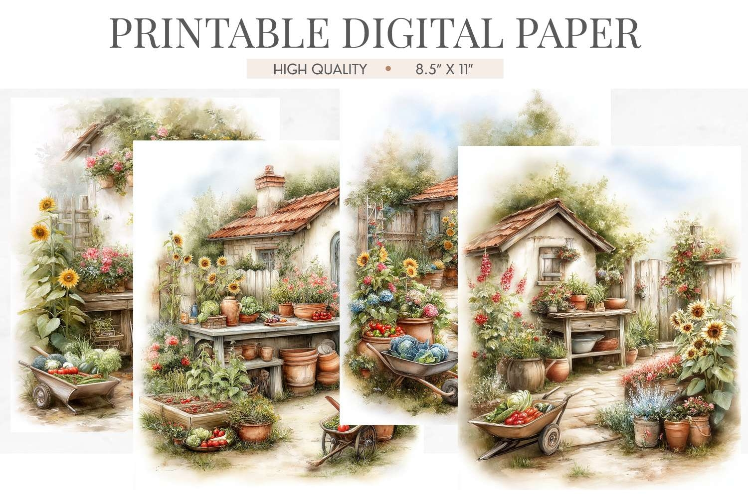 Celebrate the harvest season with this charming set of 4 watercolor junk journal pages featuring a bountiful summer kitchen garden. Each page is filled with raised beds of tomatoes and herbs, sunflowers along the fence, a rustic potting bench with terracotta pots, and a wheelbarrow overflowing with fresh vegetables. These warm, inviting pages are perfect for garden journals, recipe scrapbooks, and farmhouse-themed projects. Each page is 8.5 x 11 inches at 300 DPI.
