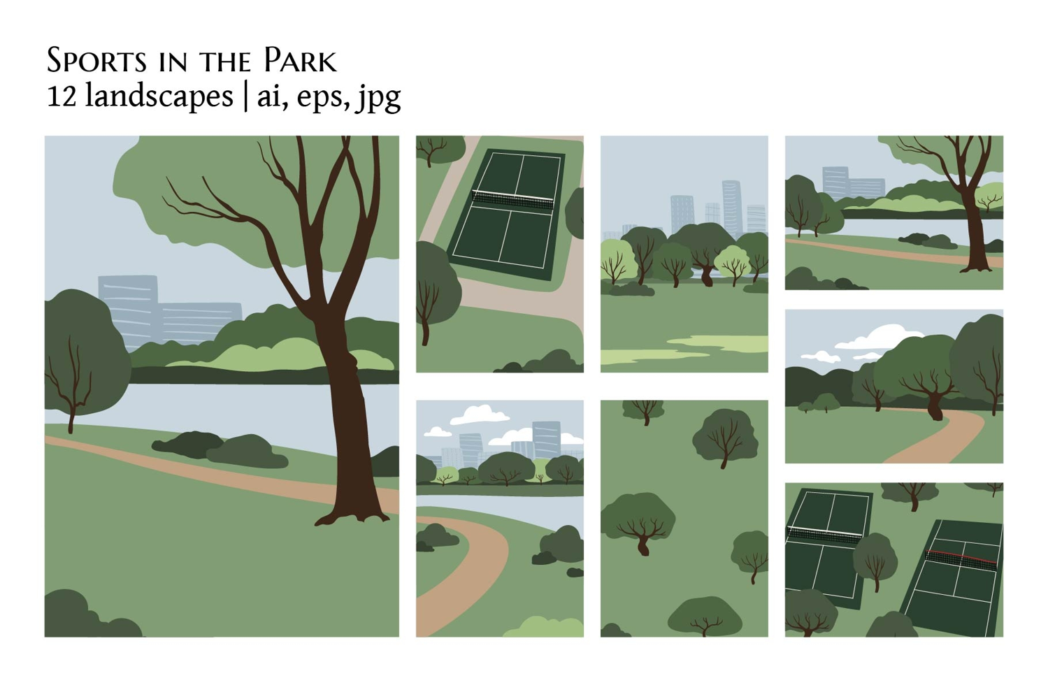 A collection of urban park landscapes featuring lakes, tree-lined paths, and city skyline views. Scenic nature scenes with winding trails, rivers, and sports courts. Flat vector illustration.