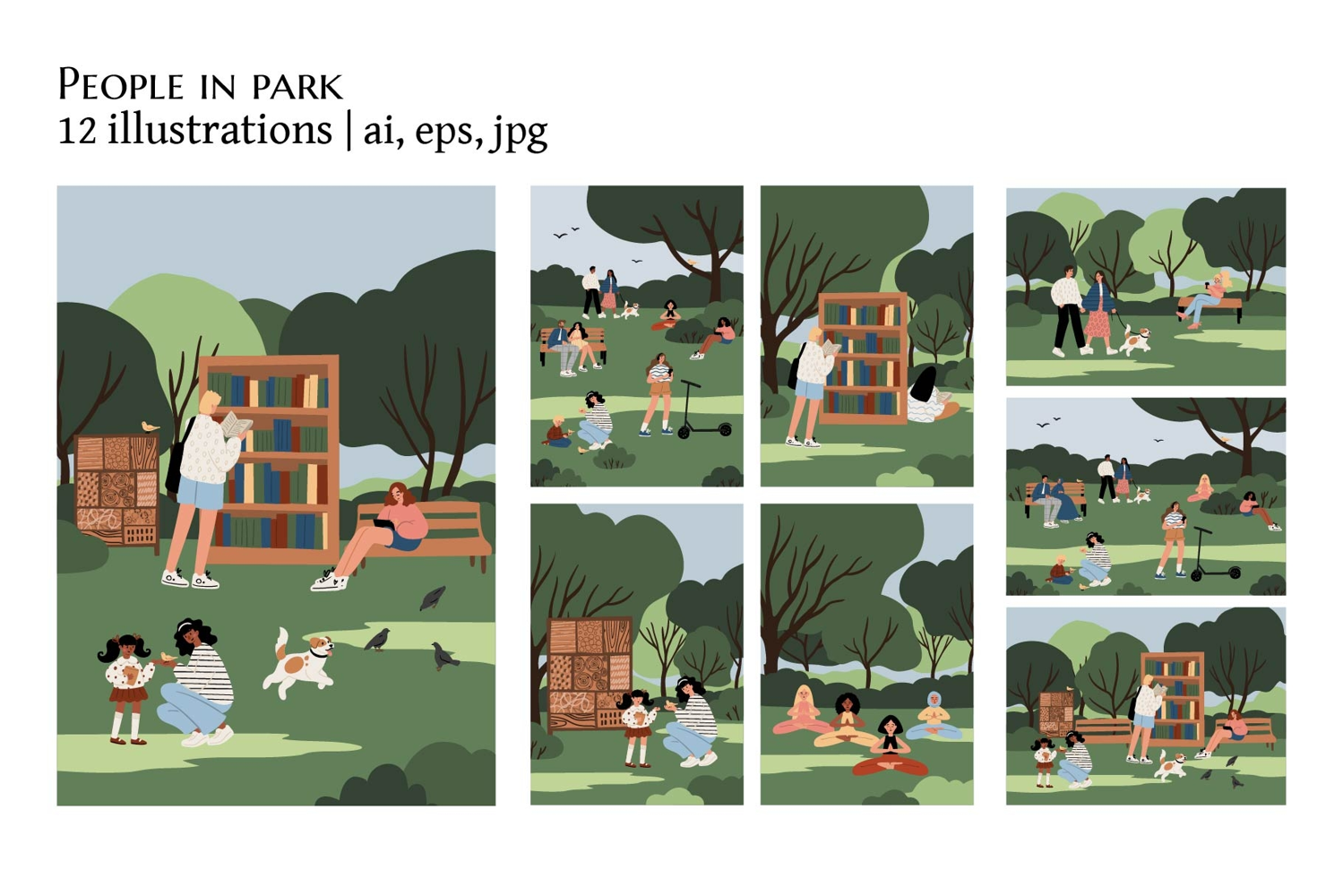 Flat vector illustration set of diverse people enjoying life in a green park. Families feed birds, friends talk on benches, women practice yoga and meditation, and children read or play with pets under trees. The collection captures outdoor leisure, nature, diversity, and community moments in warm summer light, perfect for modern lifestyle, relaxation, and connection with nature.