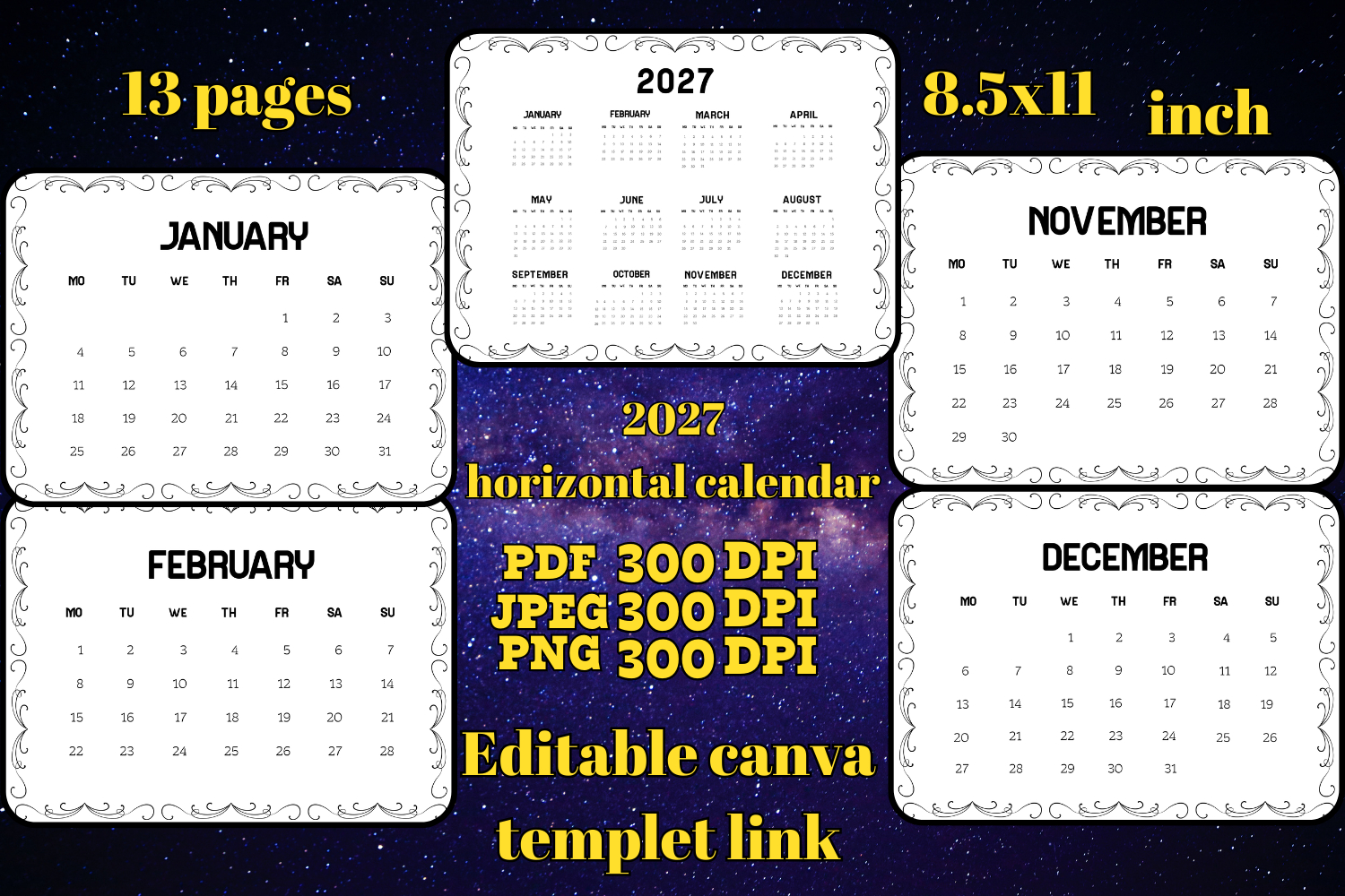 This is an instant downloadable, editable modern black and white Canva 2027 calendar Template for any person who wants to regulate his/her life . This template is 100% customizable in the FREE version of Canva. This means that you will be able to easily change the fonts, colours, background,etc. to fit your own brand.