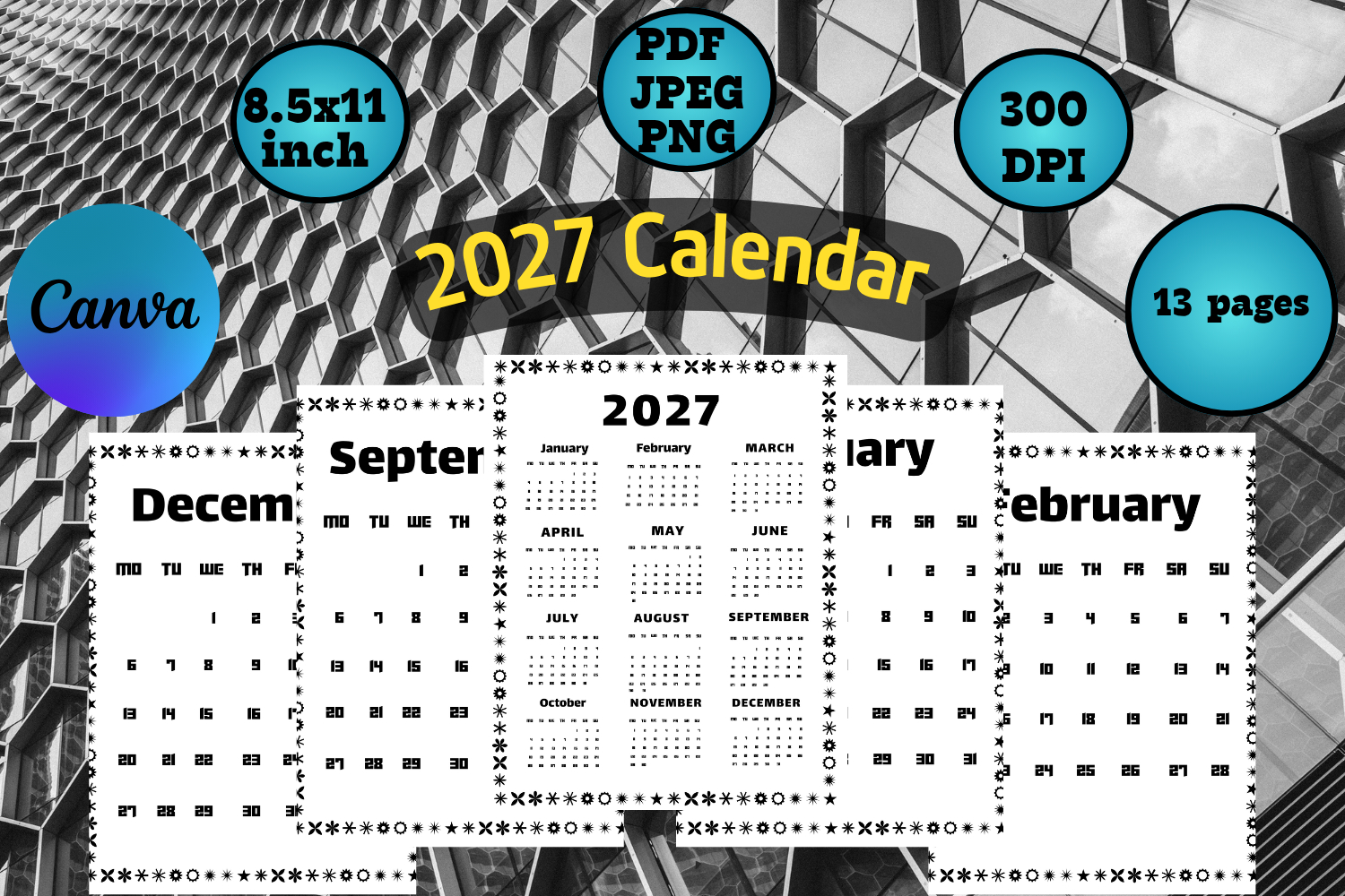 This is an instant downloadable, editable modern black and white Canva 2027 calendar Template for any person who wants to regulate his/her life . This template is 100% customizable in the FREE version of Canva. This means that you will be able to easily change fonts, colours, background,etc. to fit your own brand.