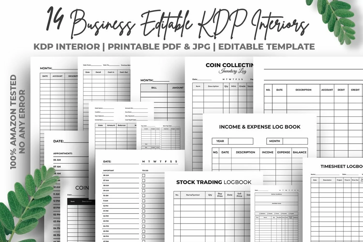 Hi, This is 14 Business Editable KDP Interiors 100% Tested on Amazon KDP is perfect for growing fastly your KDP Low & No content book publishing business on Amazon 100% vector editable & resizable PDF, you can change the size easily because It's also vector & adobe illustrator supported PDF, also ready for notebook, journal, diary, ready to printing.