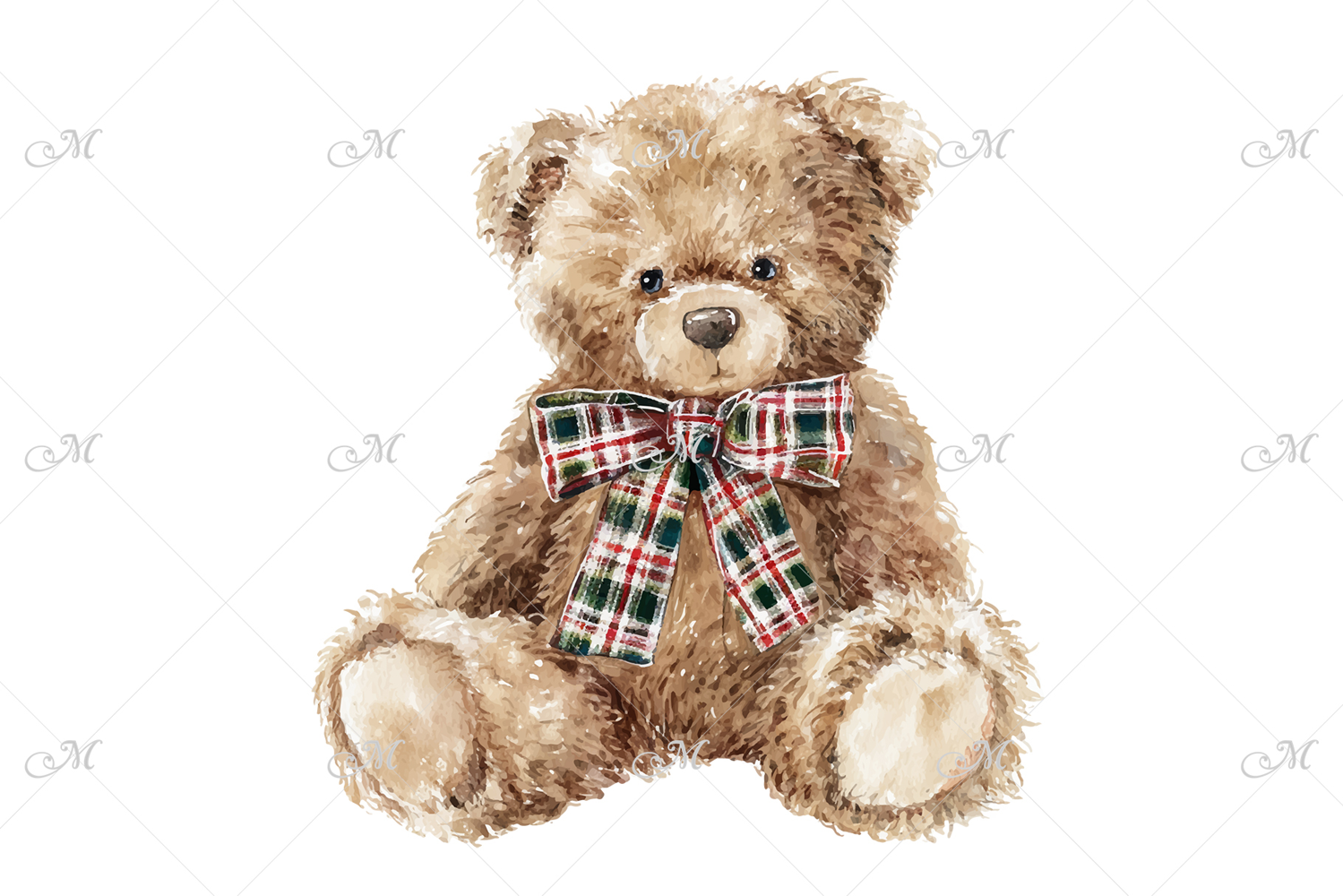 Watercolor illustration of a fluffy cuddly Teddy Bear with a plaid bow.