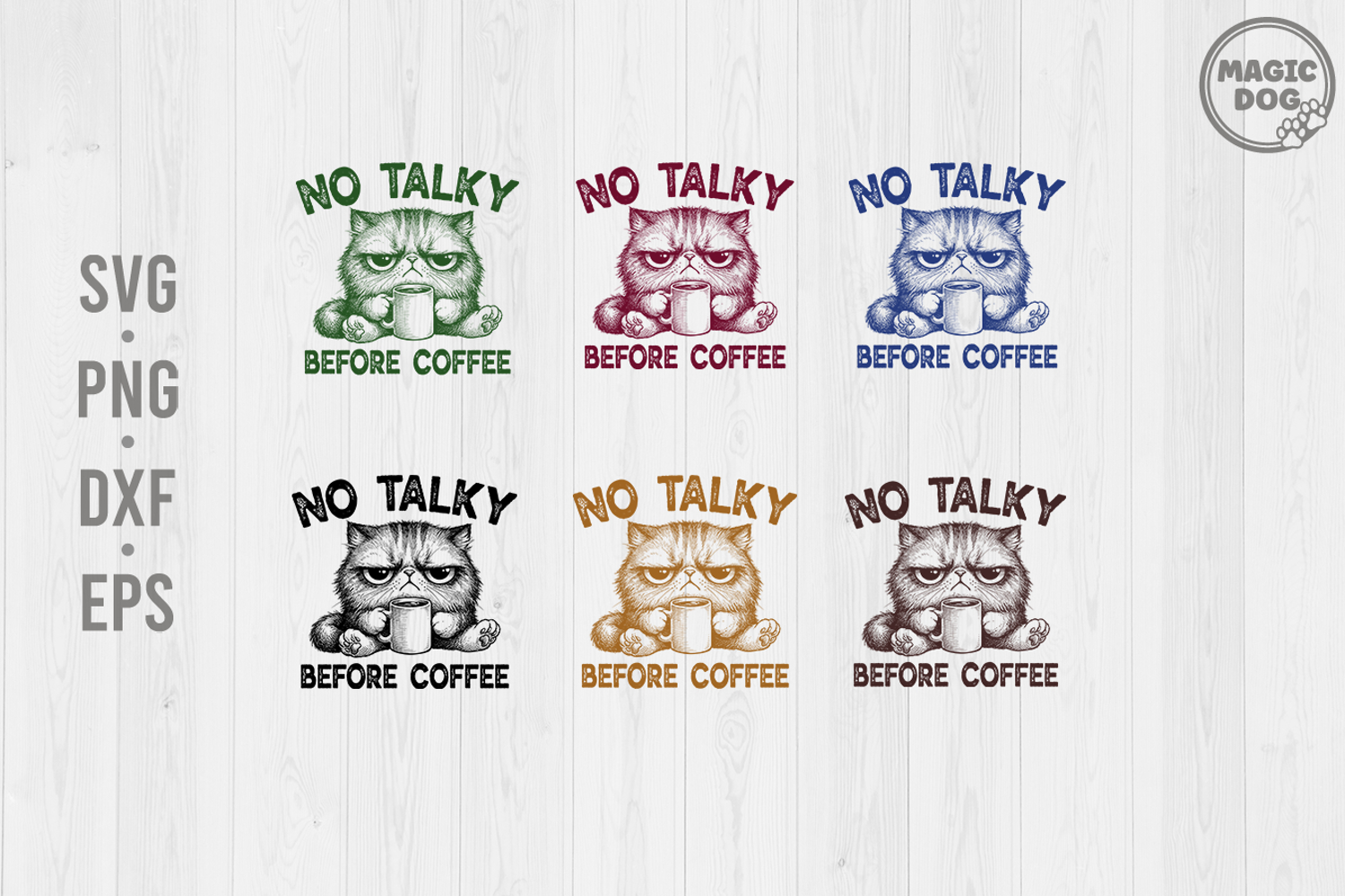No Talky Before Coffee Funny Cat Meme, Adult Humor, Cat Lover Trendy Woman's SVG, PNG, EPS, and DXF files. Printing on the t-shirts, Mugs, Bowls, Pillows, Posters, Wallpaper, and many other things you want.