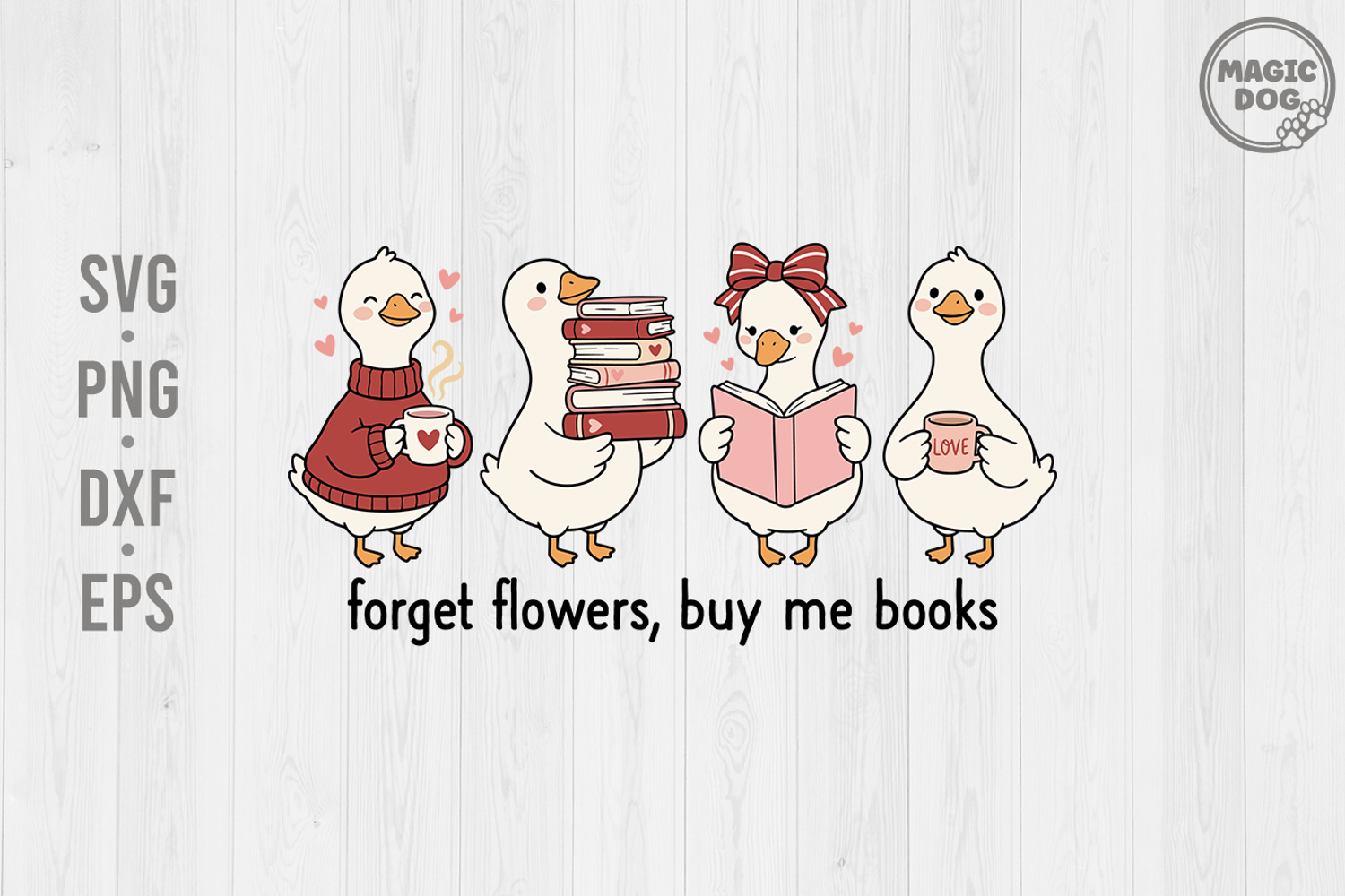 Forget Flowers, Buy Me Books. Cute Goose Reading, Book Lover Goose, Valentine Bookish Bookworm Valentine SVG, EPS, PNG, and DXF files. Printing on t-shirts, Mugs, Bowls, Pillows, Posters, Wallpaper, and other things you want.