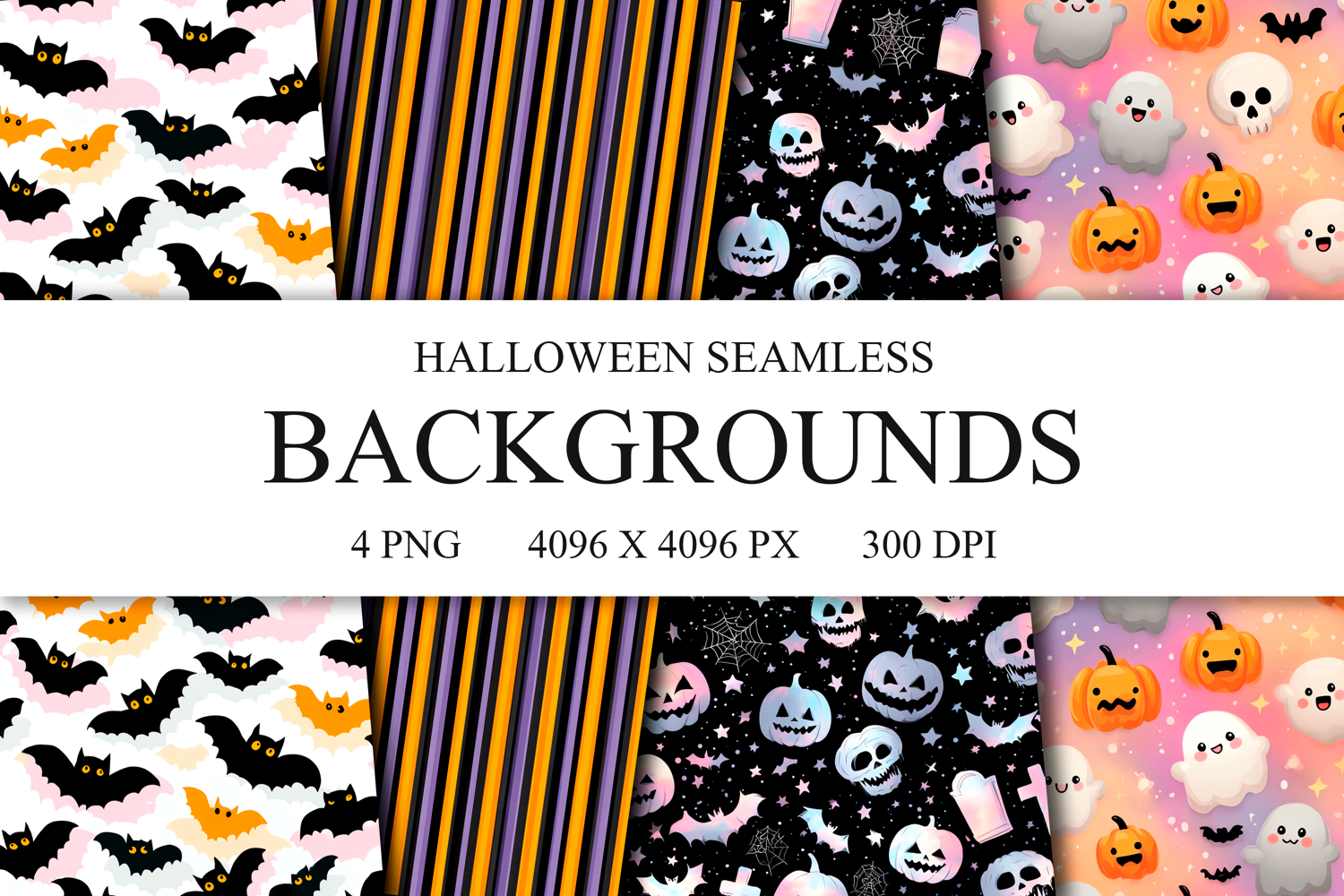 4 Spooky Cute Halloween Seamless Patterns, Digital Paper PNG
