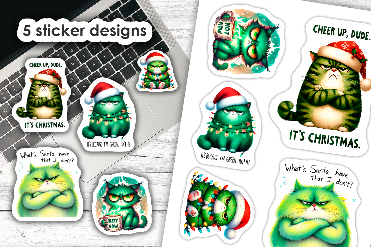 Grumpy Green Cat Funny Christmas Stickers PNG Files example image 1