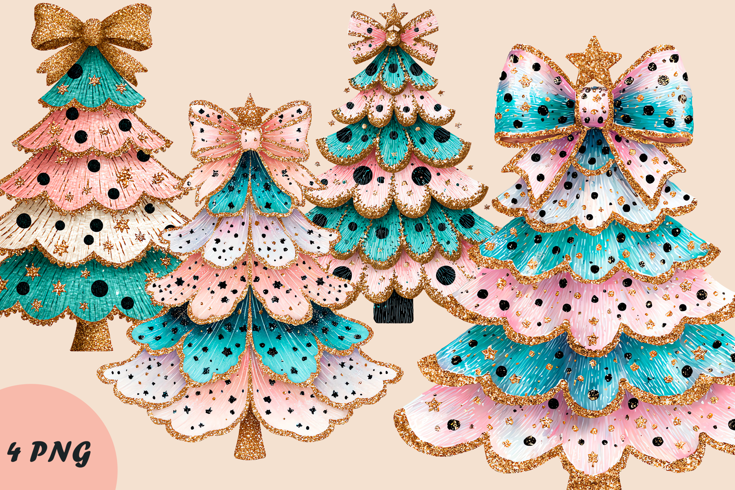 4 Whimsical Christmas Trees Clipart, Whimsy Xmas PNG Files