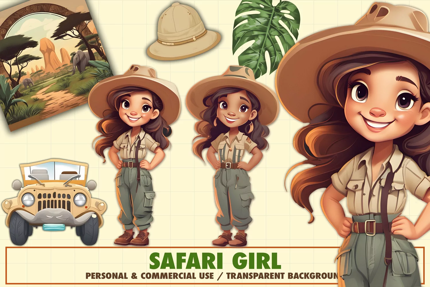 This cute safari girl illustrations is ideal for invitations, digital scrapbooking, packaging, textiles, crafts, and all other projects you can think of!