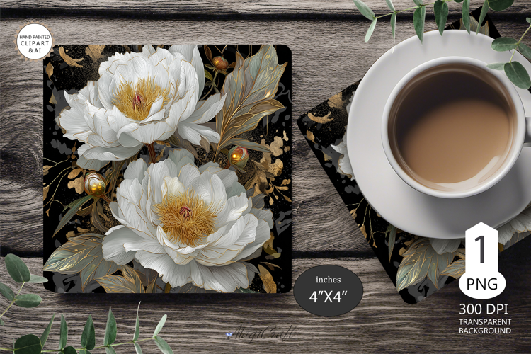 Mug coaster white peonies| Mug Coaster Sublimation flowers