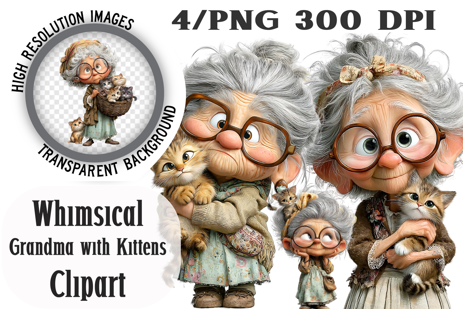 Similar Design Products to Whimsical Grandma with Kittens Clipart
