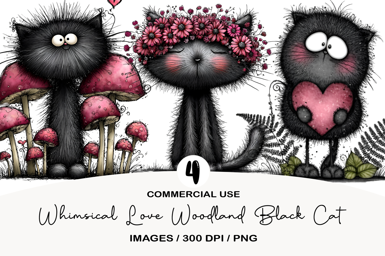 Whimsical Love Woodland Black Cat Clipart example image 1