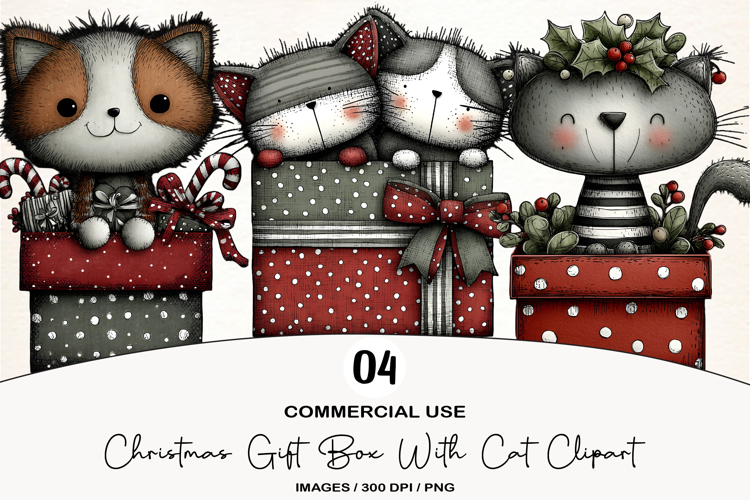 Illustration Christmas Clipart Clipart Png Christmas Png Sublimation Design Holiday Png Christmas T-shirt Design Christmas Sublimation Png Whimsical Christmas Clipart Christmas Gift Box With Cat Clipart