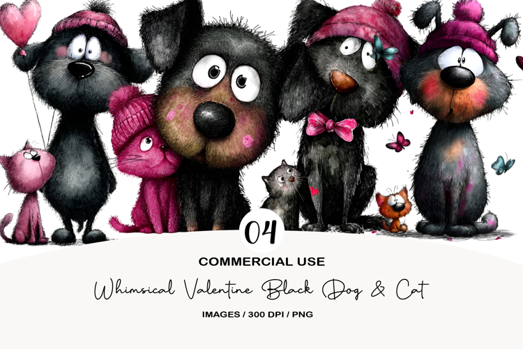 Whimsical Valentine Black Dog & Cat PNG example image 1
