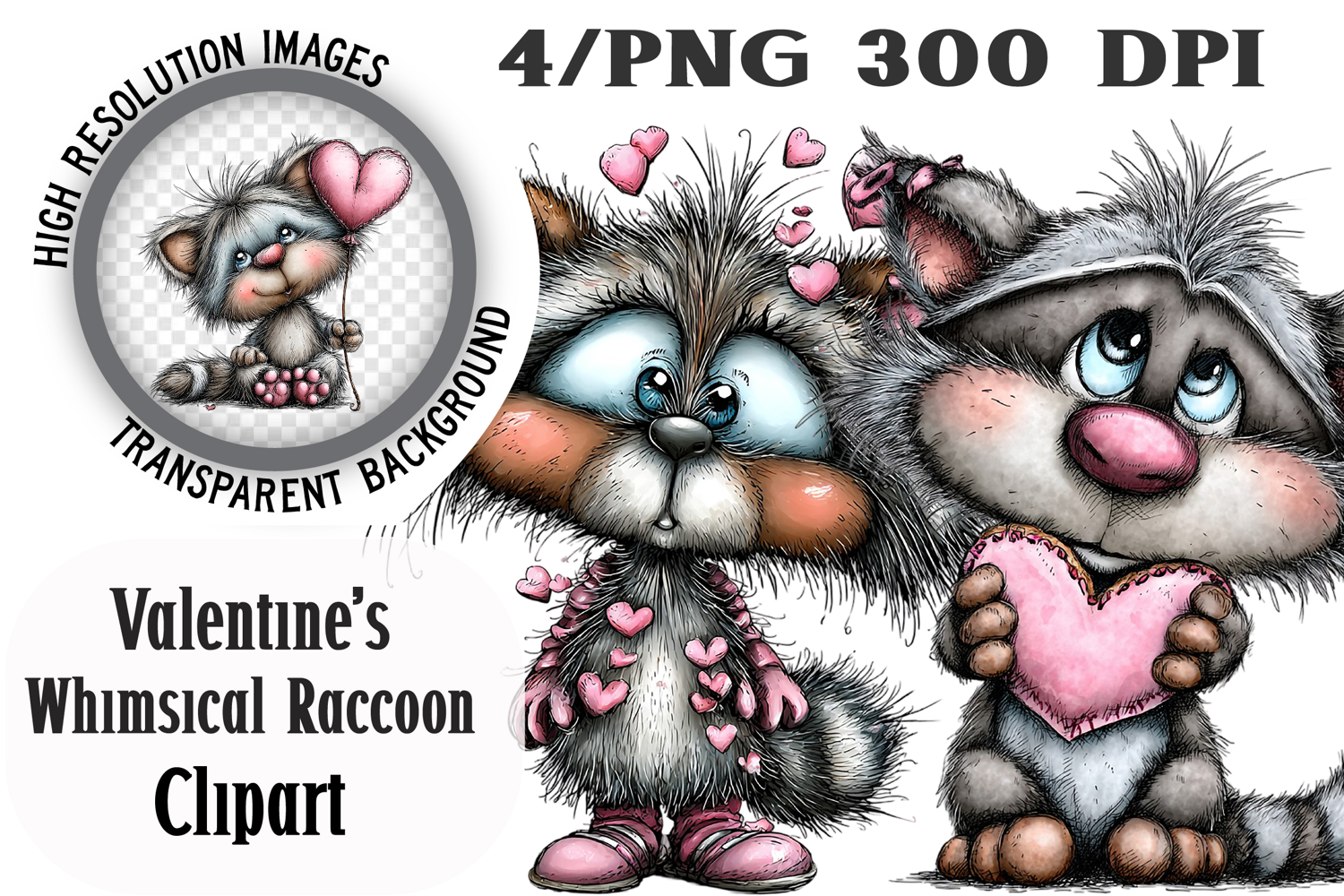 Valentine's Whimsical Raccoon Clipart PNG example image 1
