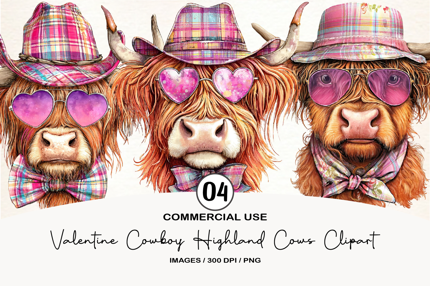 Valentine Cowboy Highland Cows Clipart, 4 Animal sublimation