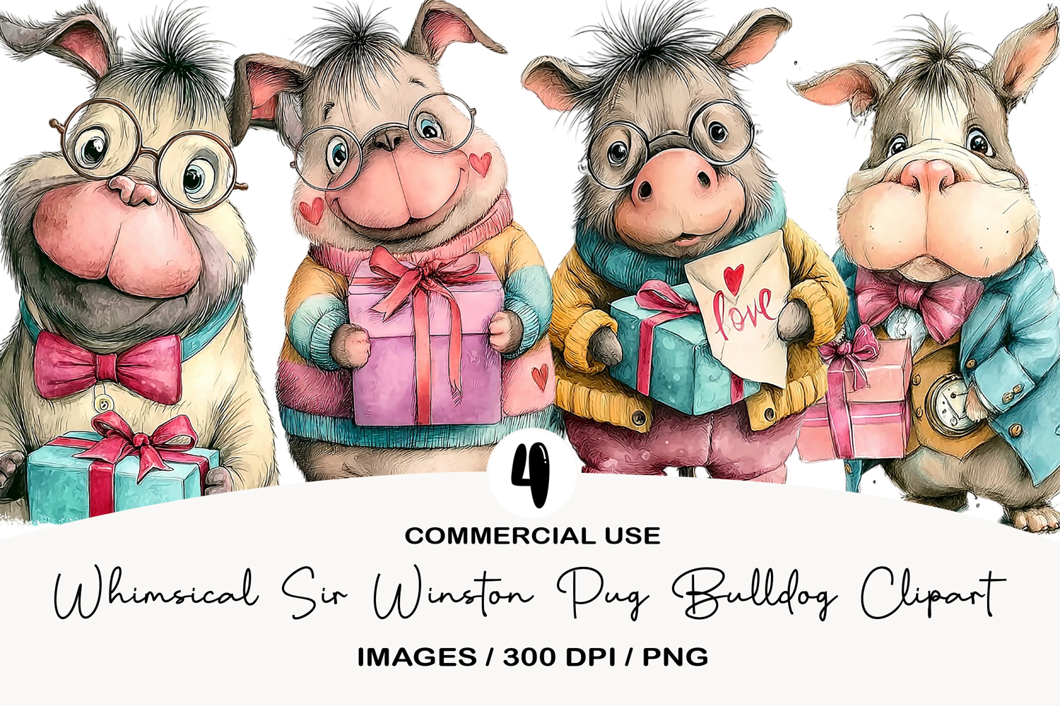 Funny Clipart Valentine's Day Clipart Sublimation Png Valentine's Day Sublimation Clipart Sublimation Png Clipart Design Clipart Png Bundle Animals Png Design Watercolor Funny Png Whimsical Sir Winston Pug Bulldog Clipart Bundle