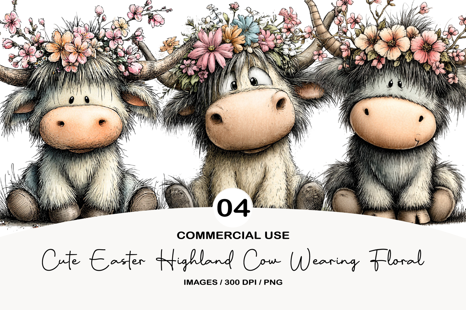 Illustration Png Easter Sticker Clipart Bundle Easter Clipart Sublimation Design Easter Png Spring Sublimation Easter Sublimation Cute Easter Highland Cow Wearing Floral Crown