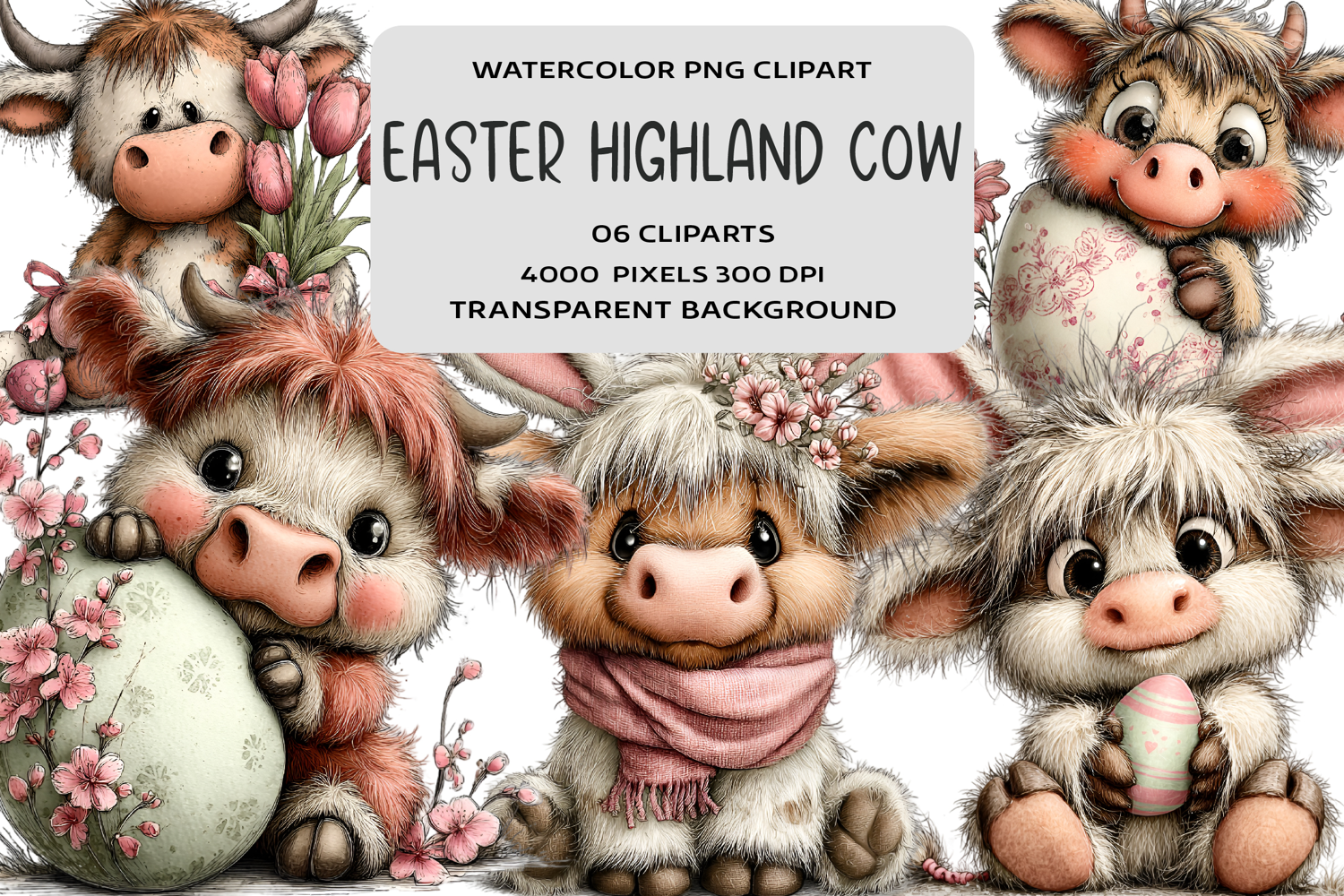 Whimsical Easter Highland Cow Clipart