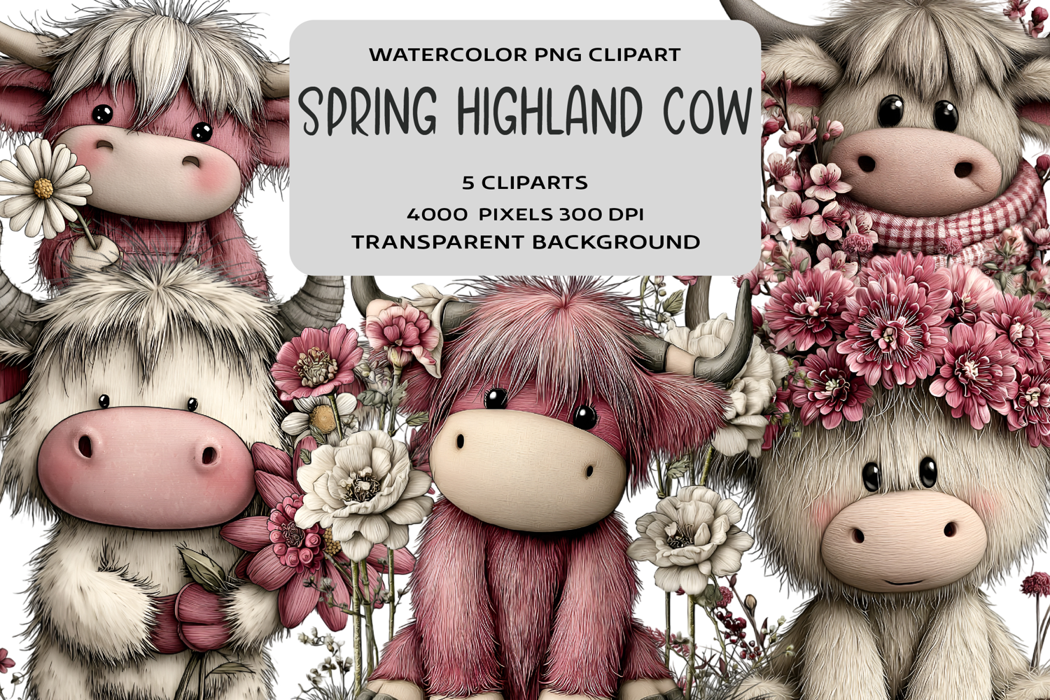 Whimsical Spring Highland Cow Clipart