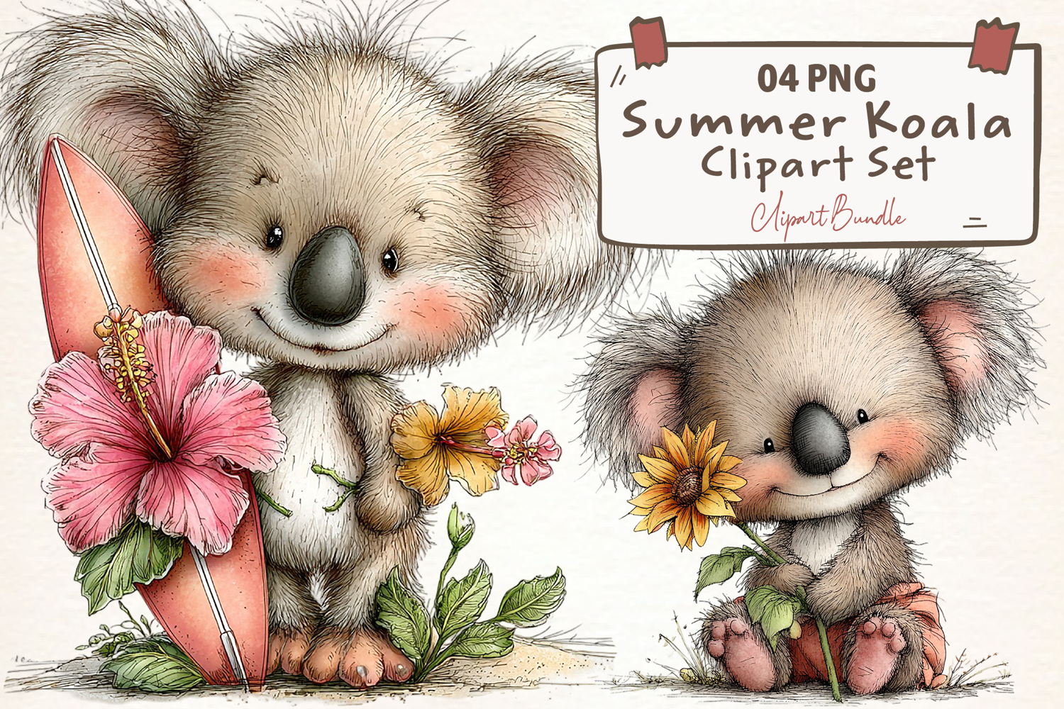 Summer Flower Clipart Summer Clipart Watercolor Summer Sublimation Hand-drawn Clipart Whimsical Clipart Whimsical Easter Whimsical Summer Clipart Summer Koala Clipart Set