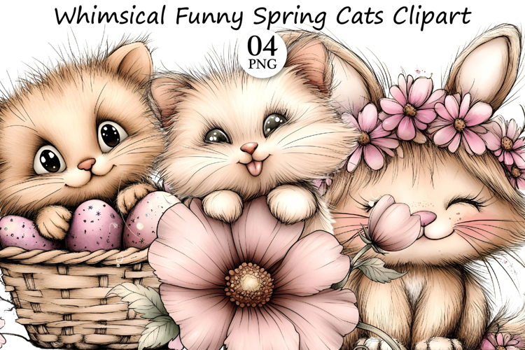Whimsical Funny Spring Cats Clipart
