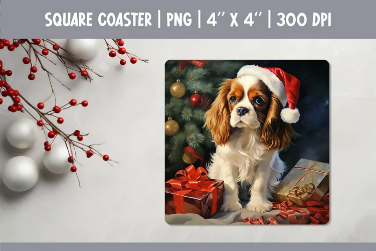 Christmas Dog Square Coaster Sublimation Design| Cavalier example image 1