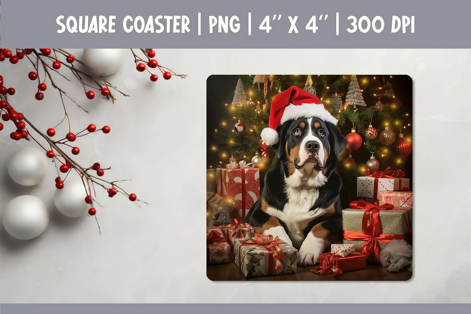 Christmas Dog Square Coaster Sublimation Design | Greater Swiss Mountain