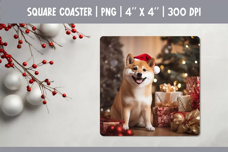 Christmas Dog Square Coaster Sublimation Design| shiba inu example image 1