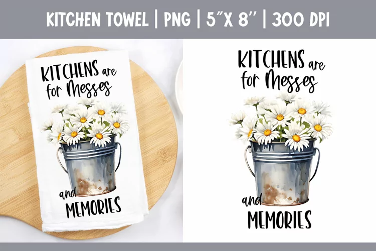 Farmhouse Kitchen Towel Sublimation Design PNG | Baisy Flower Bucket | Kitchens are for Messes and Memories