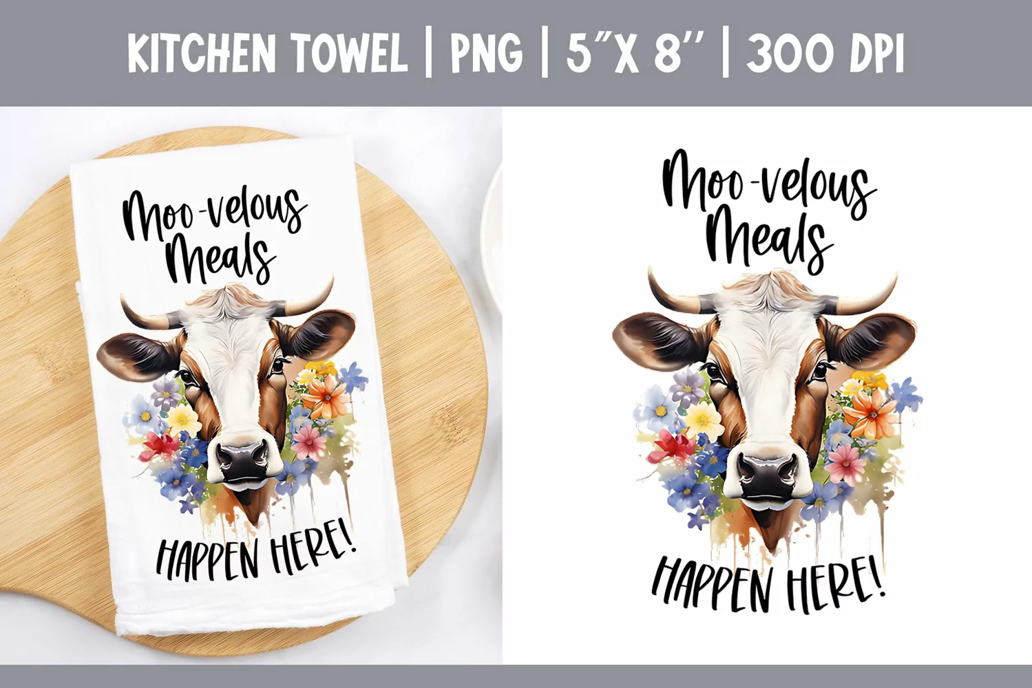 Farmhouse Kitchen Towel Sublimation Design PNG | Floral Cow | Moo-velous Meals Happen Here