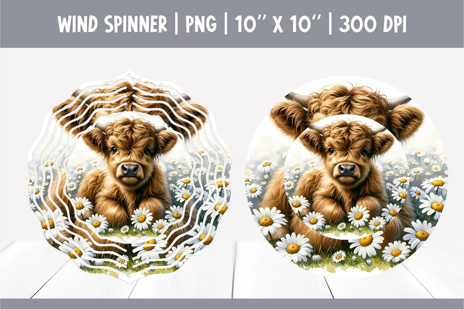 Baby HIghland Cow Spring Flowers Wind Spinner Sublimation Design PNG | Daisy