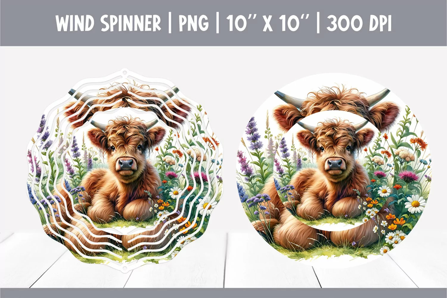 Baby HIghland Cow Spring Flowers Wind Spinner Sublimation Design PNG | Wildflowers