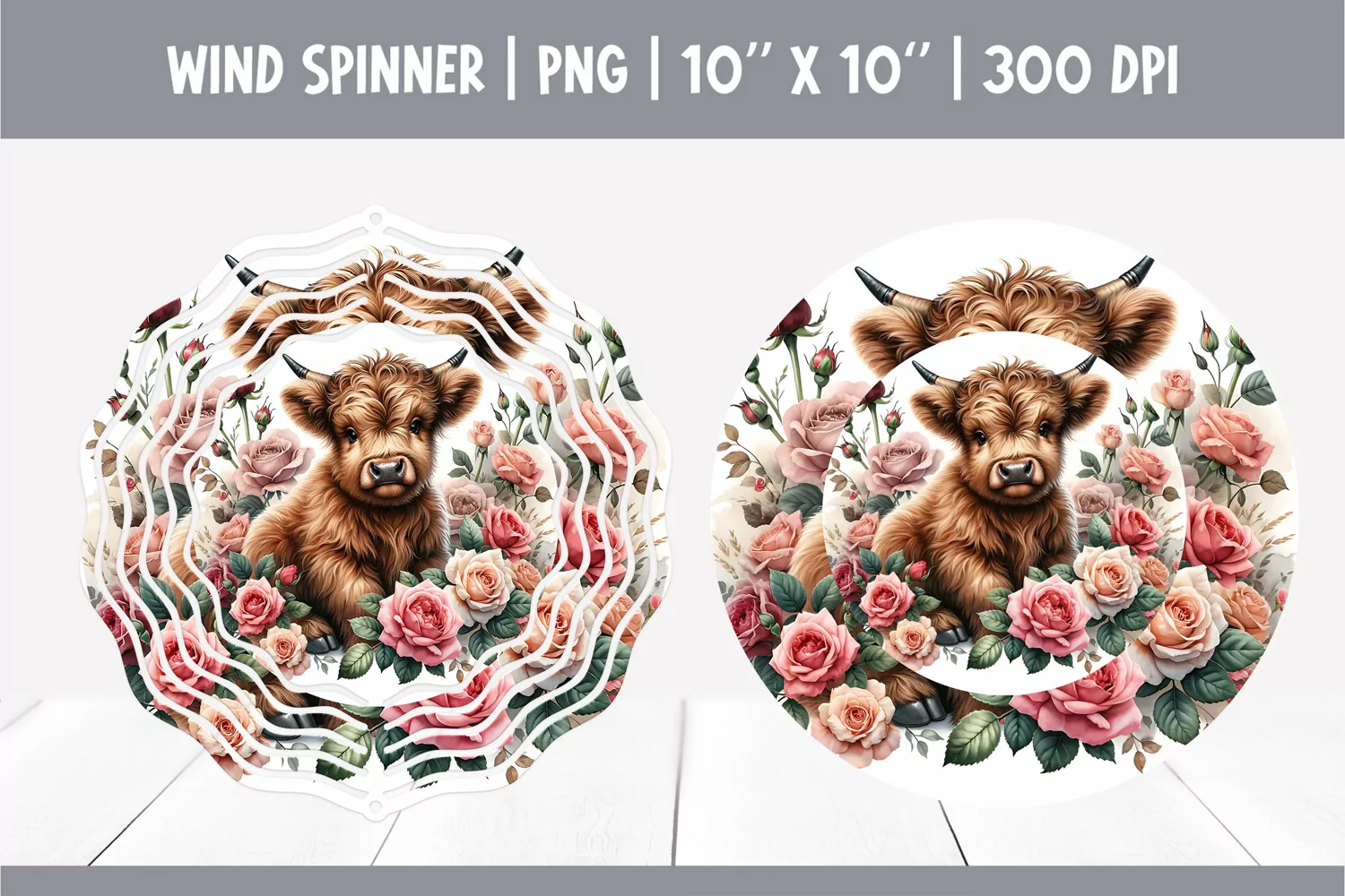 Baby HIghland Cow Spring Flowers Wind Spinner Sublimation Design PNG | Roses