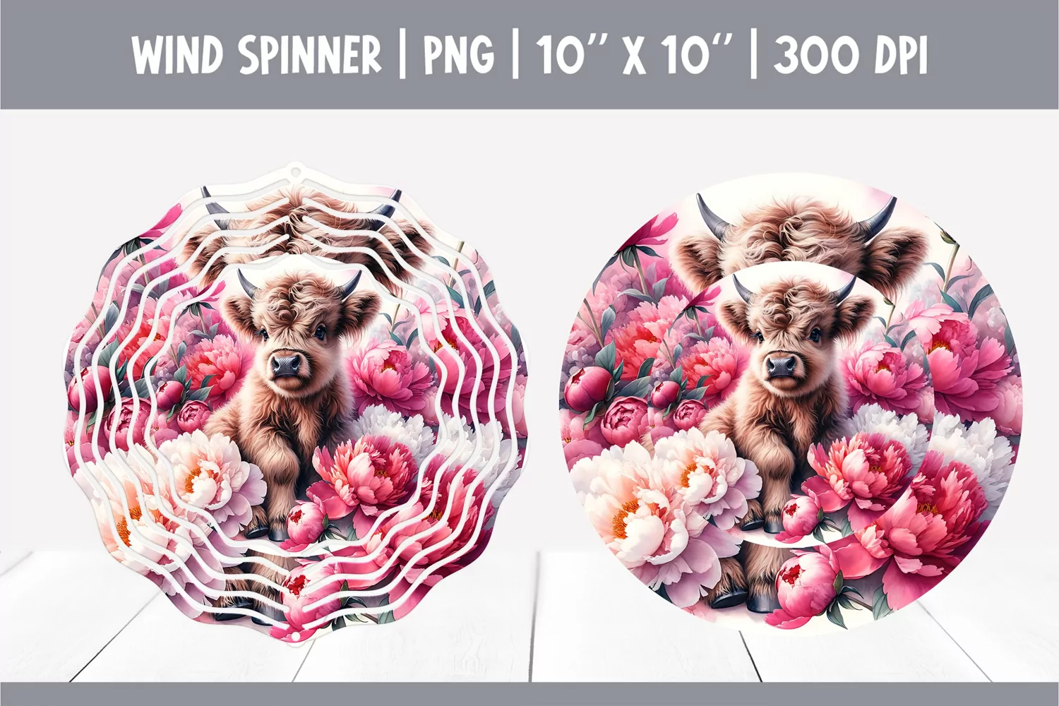 Baby HIghland Cow Spring Flowers Wind Spinner Sublimation Design PNG | Peony